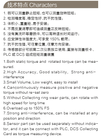 檢測電動機(jī)、內(nèi)燃機(jī)等旋轉(zhuǎn)動力設(shè)備,輸出扭矩及功率;檢測各種機(jī)械加工中心、自動機(jī)床的工作過程中的扭矩;檢測各種旋轉(zhuǎn)動力設(shè)備系統(tǒng)所傳遞的扭矩及效率;可用于制造粘度計(jì)、電動、氣動、液力扭力扳手;